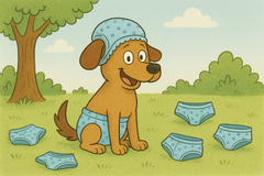 I looked out the window and almost fell over. Pickles was in the yard wearing ALL my underpants! He had one pair on his head, two pairs on his legs and one on his tail.