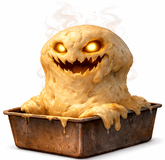 His loaf of bread sat in its pan, ready to rise. At first, it seemed normal. Then the dough began growing, much faster than it should. Two dark holes appeared like eyes. A long crack formed a mouth. The dough stretched and whispered, "More time..."